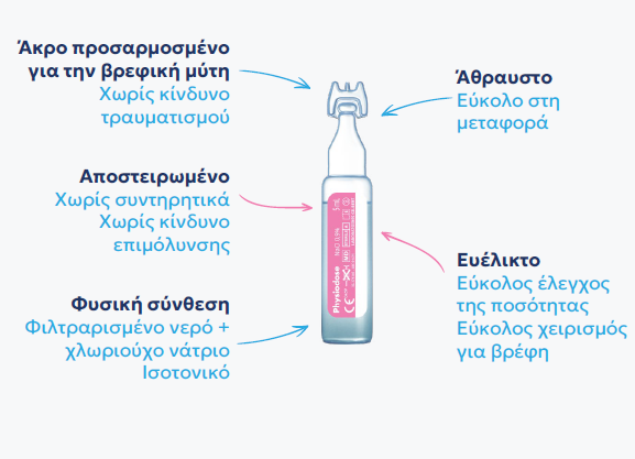 Αποστειρωμένο διάλυμα φυσιολογικού ορού (χλωριούχο νάτριο 0,9%) χωρίς συντηρητικά, χωρίς κίνδυνο τραυματισμού καθώς διαθέτει άκρο προσαρμοσμένο για την βρεφική μύτη